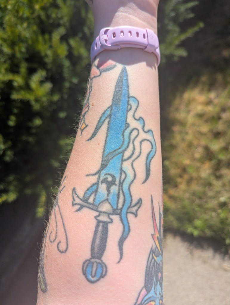 I sent Corey the literal description from the book of the sword, and the result is a beautiful design that fit my mental image perfectly. The shade of blue he chose is the most Saphira-blue I could’ve asked for, and the finishing touch of the Japanese-style flames licking the blade is my favorite part of the piece. I loved the personal touches Corey brought to this tattoo, and I hope to be able to show it to Christopher Paolini one day. I had a chance when I met him at Dragonsteel 2023, but I was wearing long sleeves and was way too awestruck by a face-to-face conversation with my literary idol to remember.