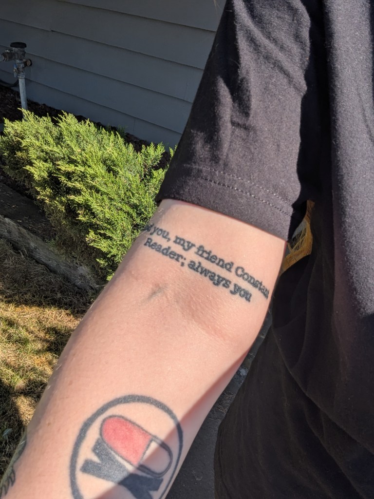 Starting small, this tattoo was always somewhere in my head, but in a much worse form. I had the idea of placing it running down my bicep, your classic “line of text on bicep” tattoo that would’ve been nothing special. But Courtney, my dear friend and tattoo artist of three years had a much better idea for these words; two upright lines at the bottom of the bicep. This idea took a basic tattoo concept and made it much more unique. I love the placement and the font we chose, and while I am aware that the small text may blur over the decades, it’s one of my favorites to look down and see. The words are taken from the afterword at the end of Duma Key, my favorite Stephen King book of all time. “And you, my friend Constant Reader; always you”
