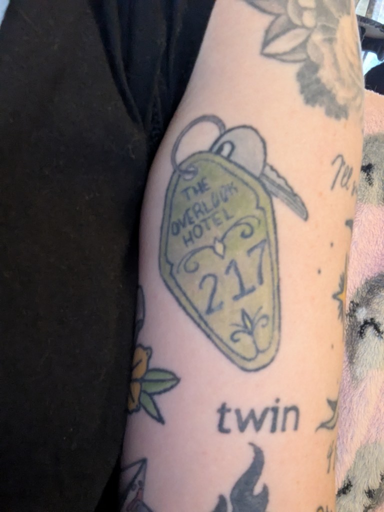 This one speaks for itself, honestly. I have seen this one and the next before, but The Shining is just too good of a book to not represent on my body. I was unsure about a color for the tag, though. Courtney to the rescue once again (you’re gonna be seeing that a lot); I love this olive green shade we went with. This tattoo is even more special to me now that I’ve stayed at the one and only Stanley Hotel, the inspiration for the book. I’ve stood right in front of the actual room 217 that King stayed in that fateful night right at the end of their season.