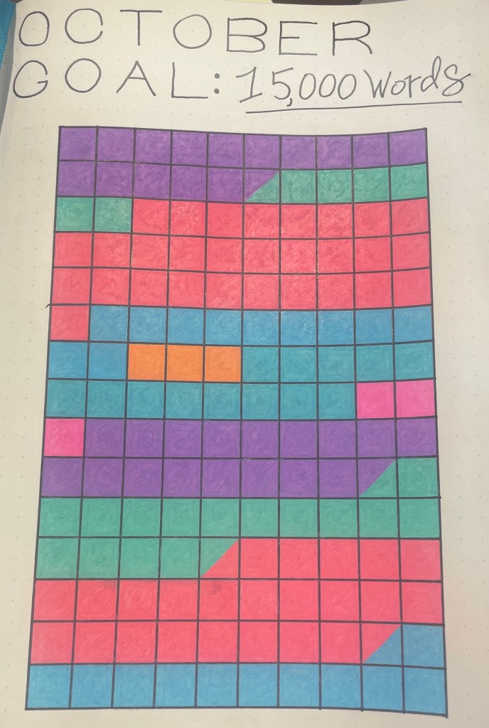 So what does this mean for November? As many of you may know, November is NaNoWriMo, where writers go through the month with the goal to write a 50,000 word novel. And while the organization has shut down due to (very justified) backlash because of their acceptance of AI, the tradition will still be popular for many. I myself have never gotten too far into NaNoWriMo and don’t think I’ll try to finish a whole novel this month (though that would be spectacular), I still want to elevate my goal from October.