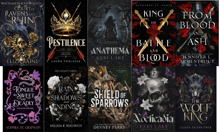 Why does every dark romance cover have skulls, crowns, a wolf, a snake, or a raven, crossed weapons, and either black, white, or red flowers? Once again, it took me barely anytime to compile the above collection. Bonus points if the title follows the over-used “A [blank] of [Blank] and [Blank]” naming pattern.
