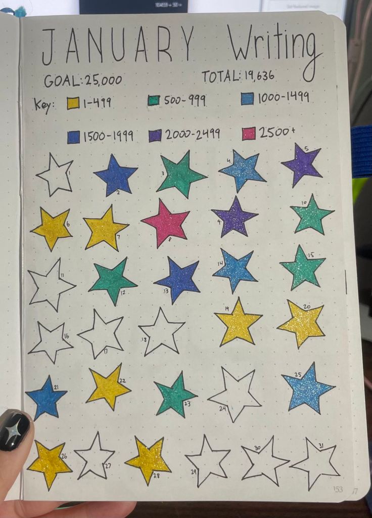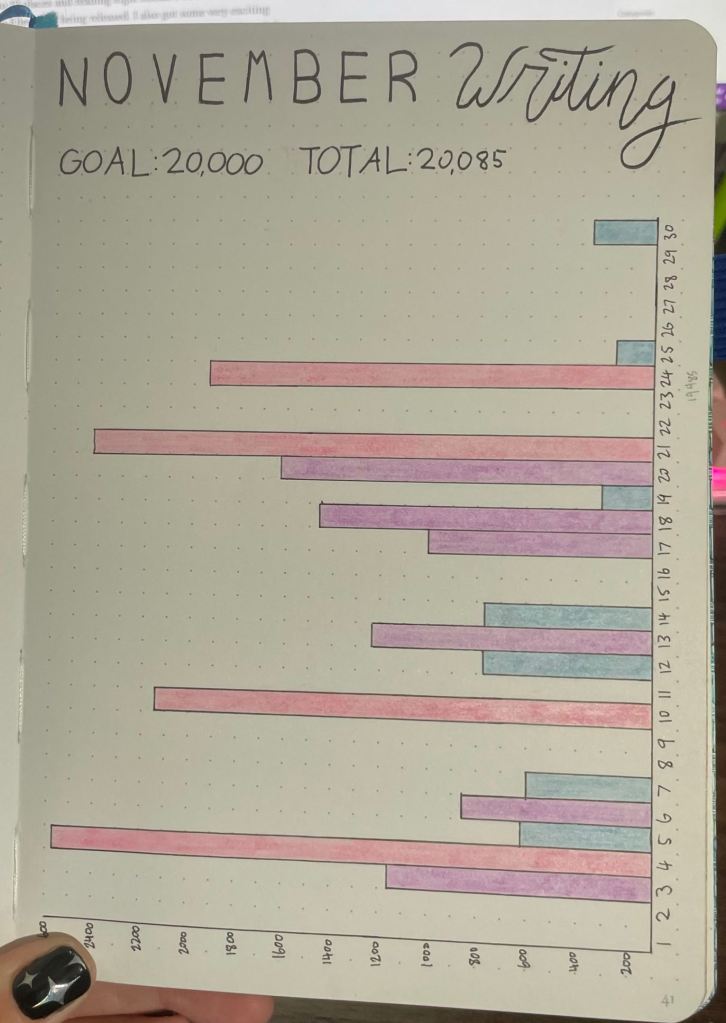 In October, one of the things I did was begin to track my daily writing. It was a lot of fun to see how far I could get in some sessions, and to see how a whole month of work comes together. Since then, I’ve continued to keep track of my daily progress, as well as some other monthly goals/events that I enjoy seeing compiled. It’s also helped me with my 2026 goals and keeping them in line.
