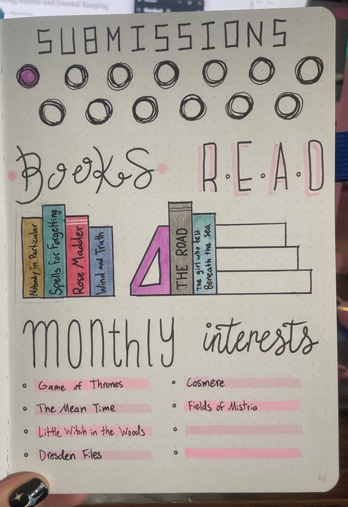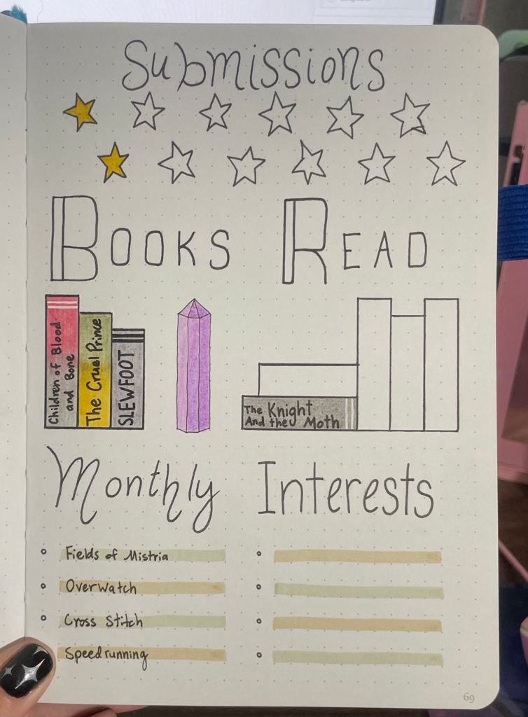 My old one was mainly used for tracking assignments, but I don’t have due dates or too much to do outside of work to warrant the dedication (thank goodness for that!). So I narrowed my journal down to four things I want to track each month: How many words I write, how many submissions to publishers I make, how many books I read, and what my monthly interests are.