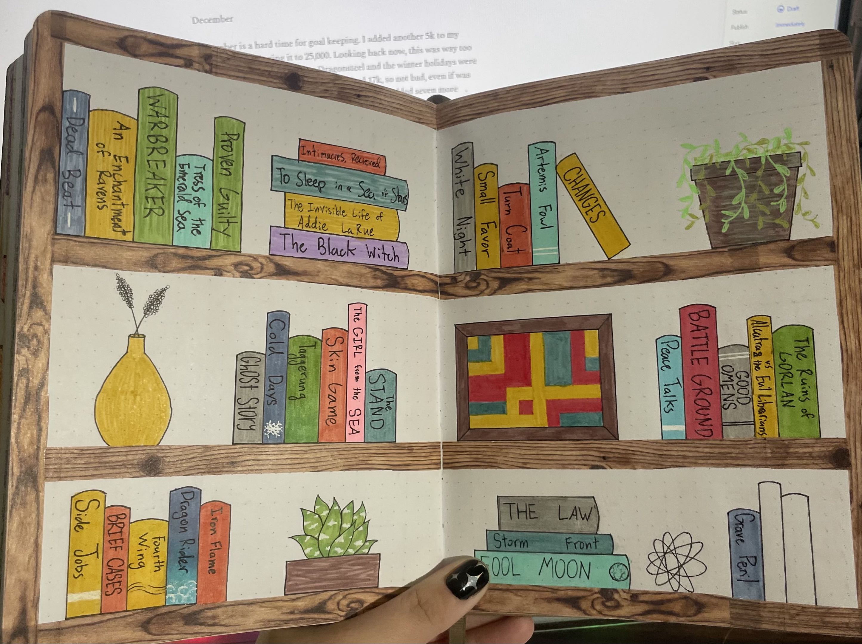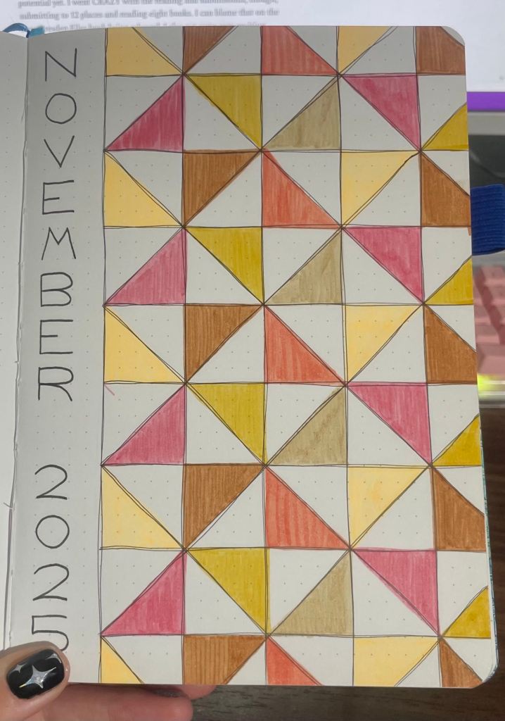 Last month was interesting. More burnout going on, lost motivation for projects, and overall seasonal melancholy. Once again, I was well under the lofty goal of 25k, barely reaching 17k for the month. If it weren’t for a new project Ava and I started within the last week, I doubt I would have passed 12k. I did one submission at the end of the month, which I can blame on the news I got at the end of January, which has paused my poetry submissions. I still read six books, so not bad, and I spent a lot of time with finishing my first book journal! All of my reads from January 2024-November 2025 are completed, and I’m so excited about that.