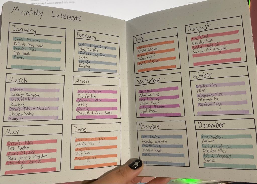 Another tracker I actually used fairly consistently was recording my monthly interests. Things that I was watching or reading or keeping up with consistently. That’s how I know I was obsessed with the Dresden files for six straight months in 2023, and how I can check when I was playing too much Stardew Valley.
