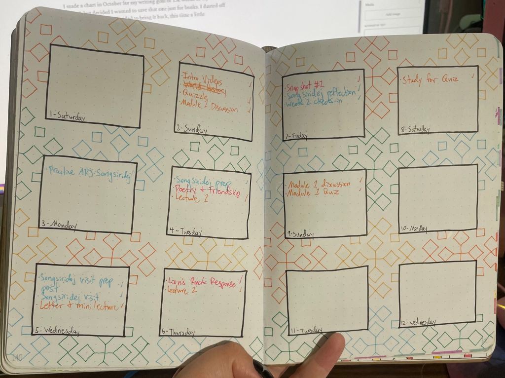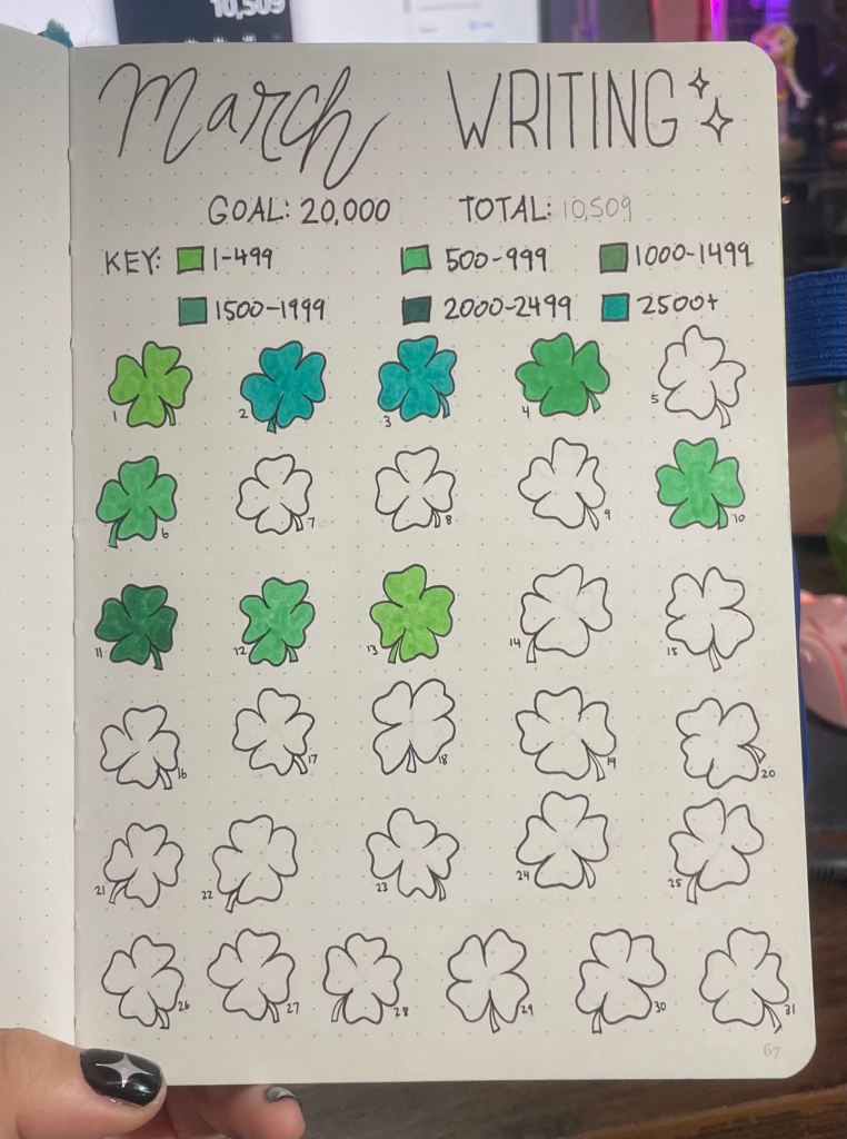 I made a chart in October for my writing goal of 15k words in my book journal, but decided I wanted to save that one just for books. I dusted off my bullet journal and decided to bring it back, this time a little differently.