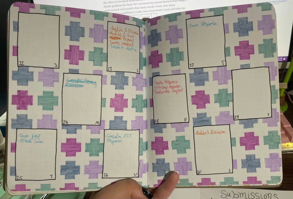 A few months ago, I had an article all about my book journal, so it shouldn’t be too much of a shock to find out that I’m a fan of bujo, or bullet journaling. I’ve been keeping track of assignments and habits and the like since 2021. I’ve done a lot of different fun trackers over the years, like water intake and daily moods and remembering my retainer and all that, but I would struggle to do super consistent daily up-keep.