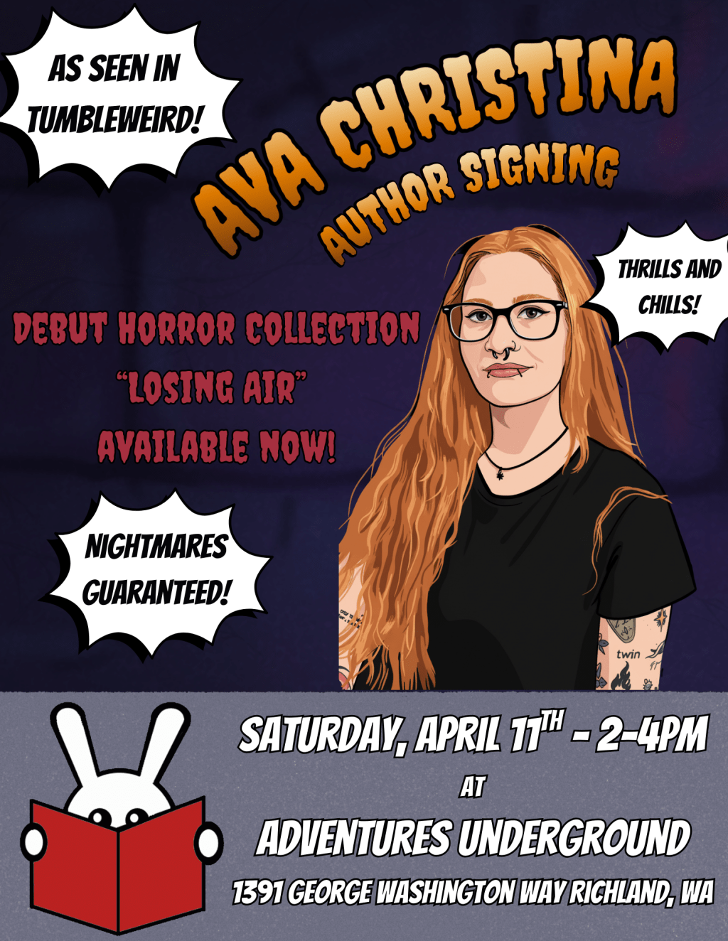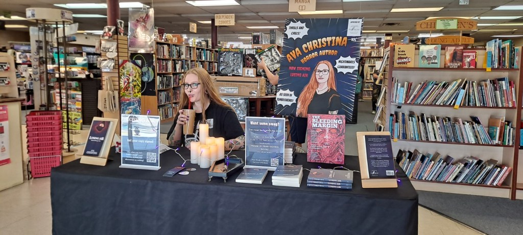 A few days ago, I signed copies of my short horror story collection, Losing Air: Dark and Strange Tales for patrons at Adventures Underground in Richland. Note that I’ve been a loyal customer at AU basically my entire life- from coming once a week during freshman year to pick up the next Harry Potter book after I finished the previous one, to placing orders for backordered records I couldn’t find anywhere, and now getting all my book preorders from them through Bookshop, these guys have been part of my life for a long time.